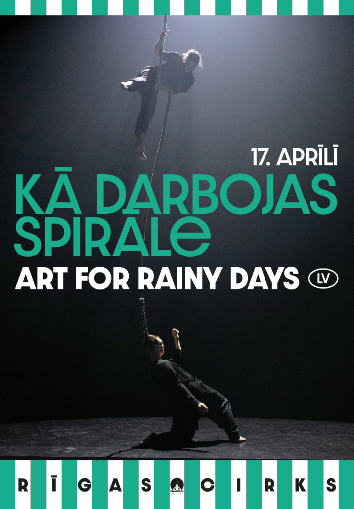 Apvienības Art for Rainy Days (Latvija, Lietuva, Lielbritānija) izrāde “How A Spiral Works” – zemes un gaisa sadarbība vienojošas saites meklējumos. Kad: ceturtdien, 5. decembrī plkst. 20.30 Kur: Rīgas cirkā, Merķeļa iela 4, Rīga Ieteicamais vecums: 7+ Izrādes garums: 45 min Par izrādi “How a Spiral Works” Dejotāja, Gaisa akrobāte, Dramaturgs un virve satiekas kopīgā…